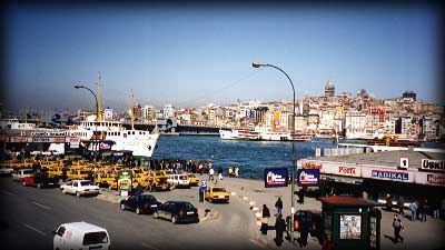 エミノニュ近辺−金角湾の向こう側の新市街にはガラタ塔が見える。新市街、旧市街、アジア側と3つに分かれているイスタンブールではフェリーがバスやとラムと同様市民の足になっている。晴れた日にはフェリーに乗ってちょっとしたクルージングへ。