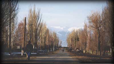 ミハイロフカ村。シルクロードの象徴でもあるポプラ並木。カラコルからスホイ=フレベット村付近までバスで来たは良いが、帰りのバスが無くなってしまい、帰りは途中まで歩くことに。そこで途中に通ったのがこの村。イシククル湖の外周の道路もポプラが立ち並んでいるが、この村の並木もその先に山々が見え印象的。