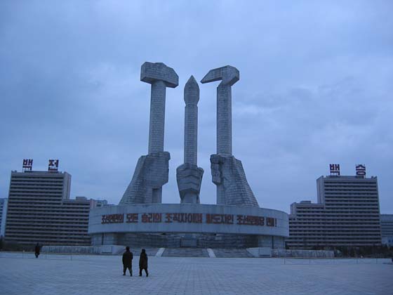 党創立記念塔。やはり、主体思想塔にあった銅像と同じく、労働者、農民、インテリの3階級を示している。この一種独特の雰囲気、たまらんですな。ちなみに後ろのビルの屋上には「百戦」「百勝」と書いてある。