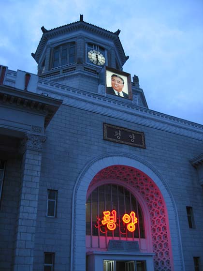 平壌駅。もちろん、駅という駅には金日成主席の肖像が。