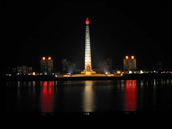 主体思想塔の夜の姿。どんなに電力が不足していても、この炎が絶えることはないでしょう。